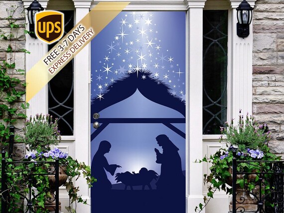 Holy Nativity Christmas Door Banner Decorations OutdoorIndoor Manger Scene Religious Blue Christmas Night Banner Home Office Decor. The Christmas door cover decorations can not only be applied as a door hanging banner door sign photo booth prop but also as a tablecloth wall. Just wrap around the face of the door.